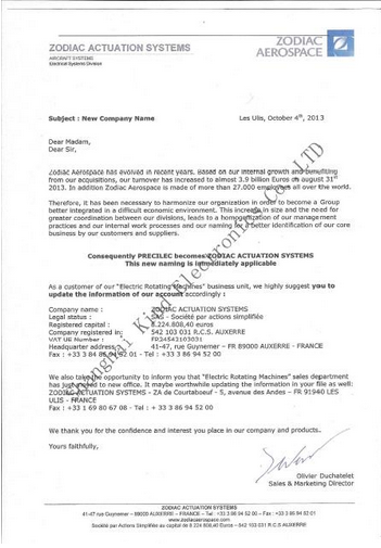 法國雷恩母公司PRECILEC更名為ZODIAC ACTUATION SYSTEMS